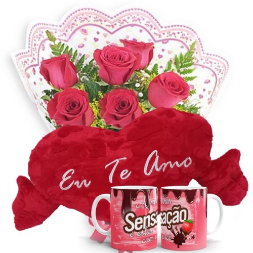 MB18-Mini Buquê 6 Rosas Vermelhas+Coração Grande "Eu Te Amo" 62x34+1Caneca de Polímero Sensação 325ml